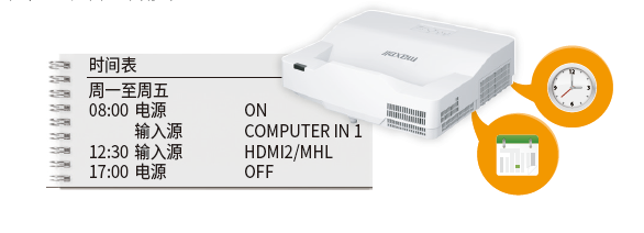 根据预先在菜单中设定的日程表,投影机可自动开、关机及切换信号源等,轻松实现管理智能化。